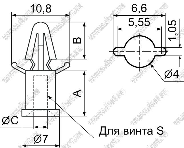 Фиксатор платы под фигурное отверстие и с резьбой под винт М3; A=7,7мм; B=2,6мм; C=5,9мм; s=1,2...1,7мм; нейлон-66 (UL); натуральный