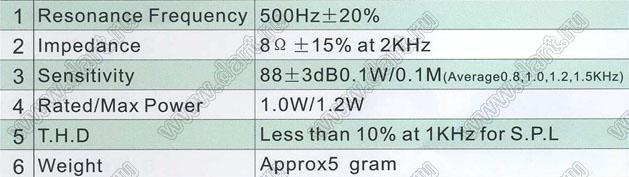 Сопротивление: 8±15% Ом (на частоте 1 кГц)
