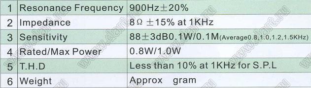 Сопротивление: 8±15% Ом (на частоте 1 кГц)