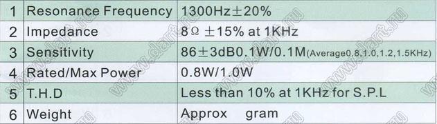 Сопротивление R: 8±15% Ом (на частоте 1 кГц)