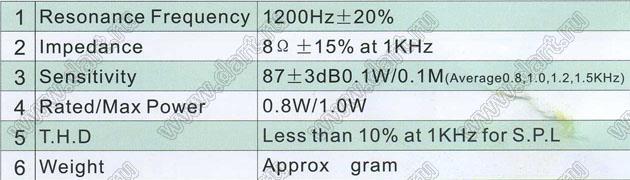 Частота резонанса F: 1200±20% Гц