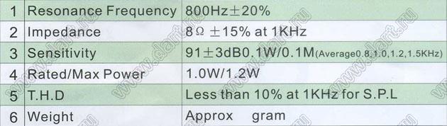 Сопротивление R: 8±15% Ом (на частоте 1 кГц)