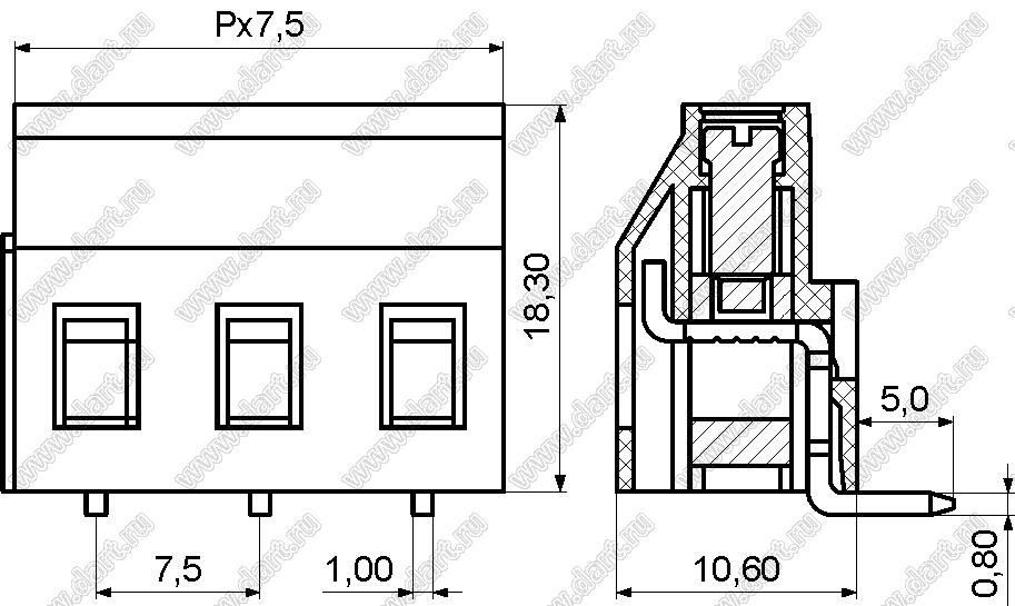 Каталог > Электронные компоненты, радиодетали > Клеммники (колодки клеммные) > Клеммники винтовые для монтажа в отверстия печатных плат > Винтовые клеммники (шаг 7,5 мм) > KF129R-7.50 (DG129R-7.5) серия > KF129R-7.50-02P-14