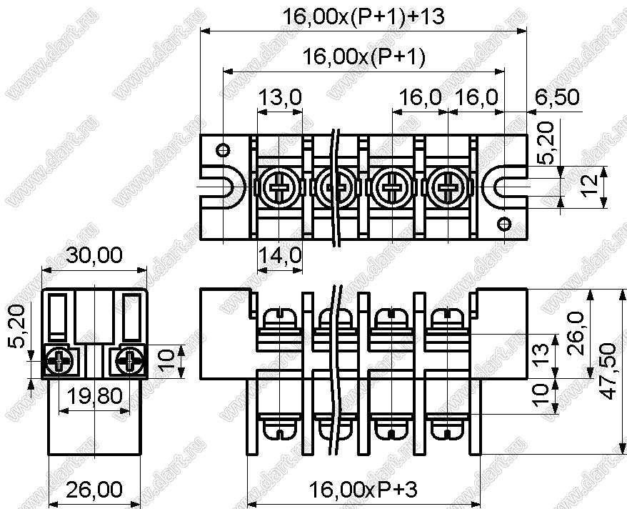 Каталог > Электронные компоненты, радиодетали > Клеммники (колодки клеммные) > Клеммники барьерные > Барьерные клеммники (шаг 16,0 мм) > KF47-16.0 серия > KF47-16.0-13P-13