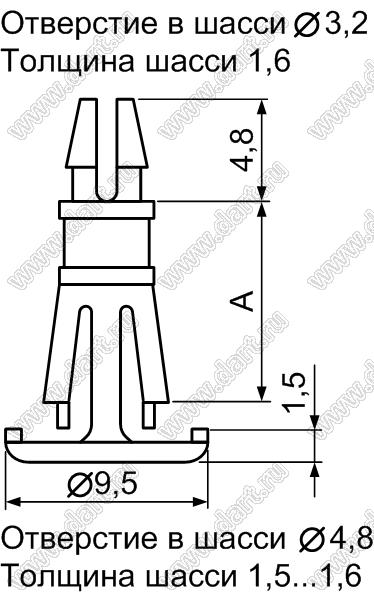 Диаметр отверстия в плате d: 3,2 мм Толщина платы S: 1,6 мм Диаметр отверстия в шасси d: 4,8 мм Толщина шасси t: 1,5...1,6 мм Материал: нейлон-66 (UL) Класс огнестойкости: 94V-2 Цвет: натуральный |