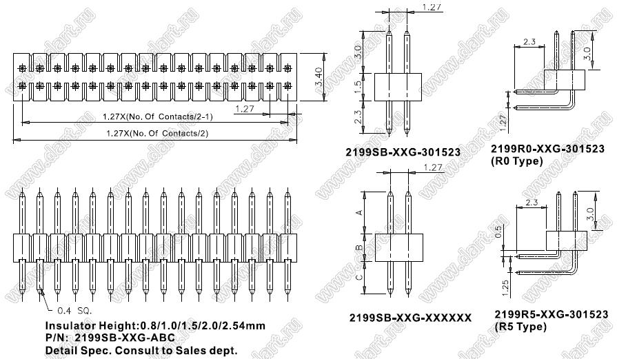 5) Размеры A, B, C в десятых долях мм: 301523: (стандарт) A=3,0мм, B=1,5мм, C=2,3мм XXXXXX