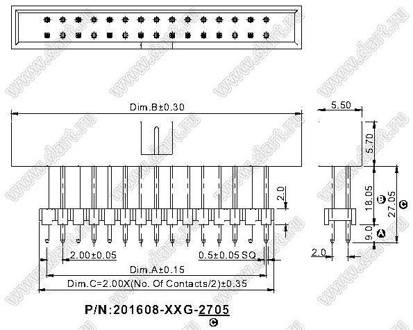 Каталог > Электронные компоненты, радиодетали > Разъёмы (соединители, переходники) > Разъемы IDC для плоского кабеля (шлейфа) > 2,00 x 2,00 > 201608S-XXG-2705 серия