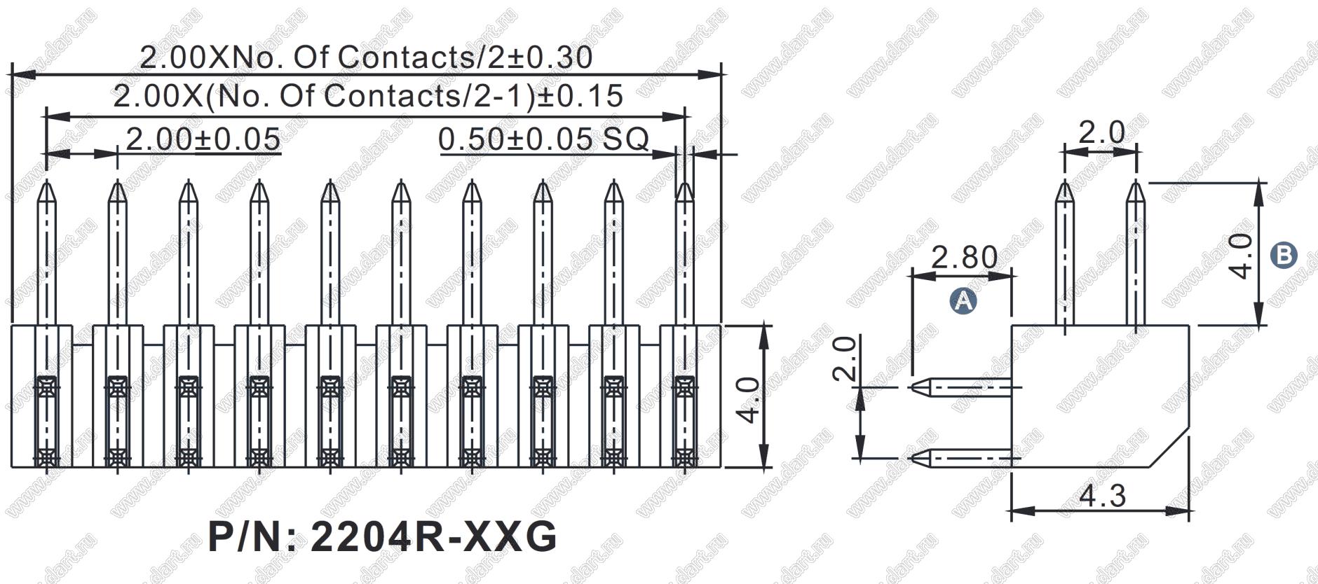 Вилки штыревые открытые угловые двухрядные на плату с увеличенным изолятором для монтажа в отверстия (шаг 2,00 x 2,00 мм)