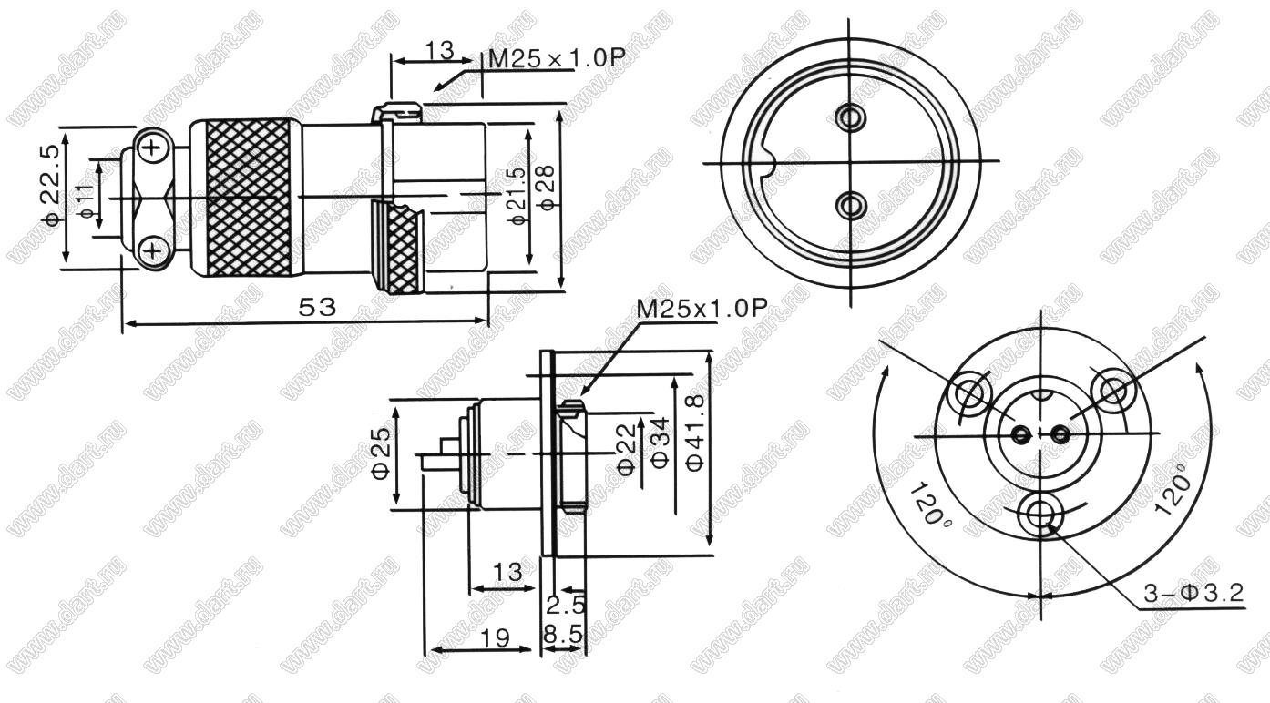 Разъемы круглые промышленные металлические (соединители низкочастотные цилиндрические) GX25 серии под отверстие в прибор диаметром 25 мм изготавливаются в пылезащитном исполнении.