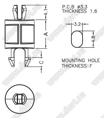 Диаметр отверстия в плате dп: 3,3 мм Толщина платы s: 1,6 мм Материал: нейлон-66 (UL) Класс огнестойкости: 94V-2 Цвет: натуральный |