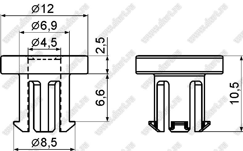 Диаметр отверстия в плате dп: 7,2 мм Толщина платы T: 5,0 мм Материал: нейлон-66 (UL) Класс огнестойкости: 94V-2/94V-0 Цвет: натуральный |
