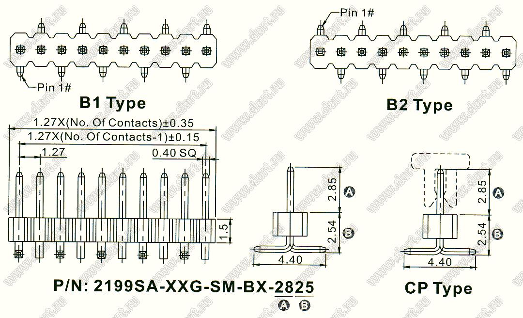Штыревые однорядные вилки для поверхностного (SMD) монтажа данной серии изготавливаются на фабрике в виде линеек с надрезанным изолятором по 50 контактов (в России принято название серии PLL1.27S). Выпускаются с левым (B1) и правым (B2)("зеркальным") расположением контактов на плате, см. чертежи ниже.