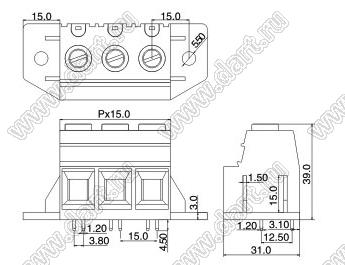 Каталог > Электронные компоненты, радиодетали > Клеммники (колодки клеммные) > Клеммники винтовые для монтажа в отверстия печатных плат > Винтовые клеммники (шаг 15,0 мм) > KF137TM-15.0 (DG137TM-15.0) серия
