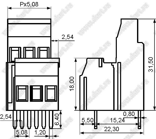 Каталог > Электронные компоненты, радиодетали > Клеммники (колодки клеммные) > Клеммники винтовые для монтажа в отверстия печатных плат > Винтовые клеммники (шаг 5,08 мм) > KF129-5.08 (DG129-5.08) серия