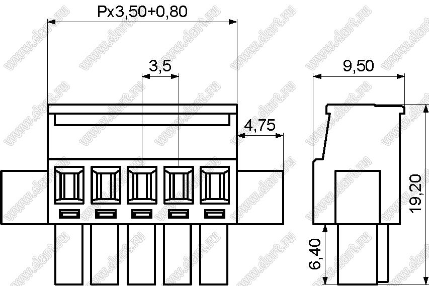 розетки однорядные на провод с угловыми входами проводов под винтовые зажимы и с монтажными ушами, шаг 3,5 мм