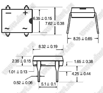 Диодные мосты для выводного монтажа на плату серии DB101...DB107 в корпусе DIP представляют собой диодные сборки монолитной конструкции, которые дешевле и меньше по объему, чем набор отдельных диодов. Диоды в мостах серии DB101...DB107 подобраны на фабрике по параметрам, максимально аналогичным друг другу.