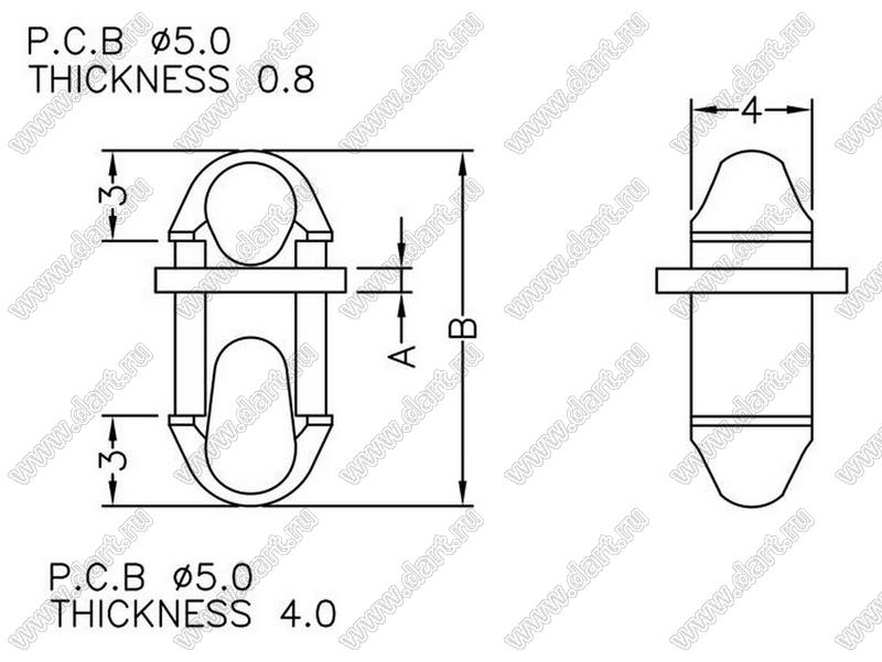 Диаметр отверстия в плате dп: 5,0 мм Толщина платы s: 0,8 мм Диаметр отверстия в шасси d отв.: 5,0 мм Толщина шасси t: 4,0 мм Материал: нейлон-66 (UL) Класс огнестойкости: 94V-2/94V-0 Цвет: натуральный |