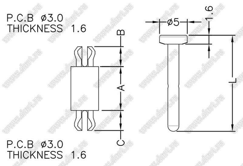 Размер B: 3,6 мм Размер C: 3,6 мм Диаметр отверстия в плате dп: 3,0 мм Толщина платы s: 1,6 мм Диаметр отверстия в шасси d отв.: 3,0 мм Толщина шасси t: 1,6 мм Материал: нейлон-66 (UL) Класс огнестойкости: 94V-2 Цвет: натуральный |