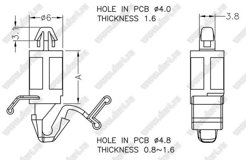 Диаметр отверстия в плате dп: 4,0 мм Толщина платы s: 1,6 мм Диаметр отверстия в шасси d отв.: 4,8 мм Толщина шасси t: 0,8...1,6 мм Материал: нейлон-66 (UL) Класс огнестойкости: 94V-2 Цвет: натуральный |