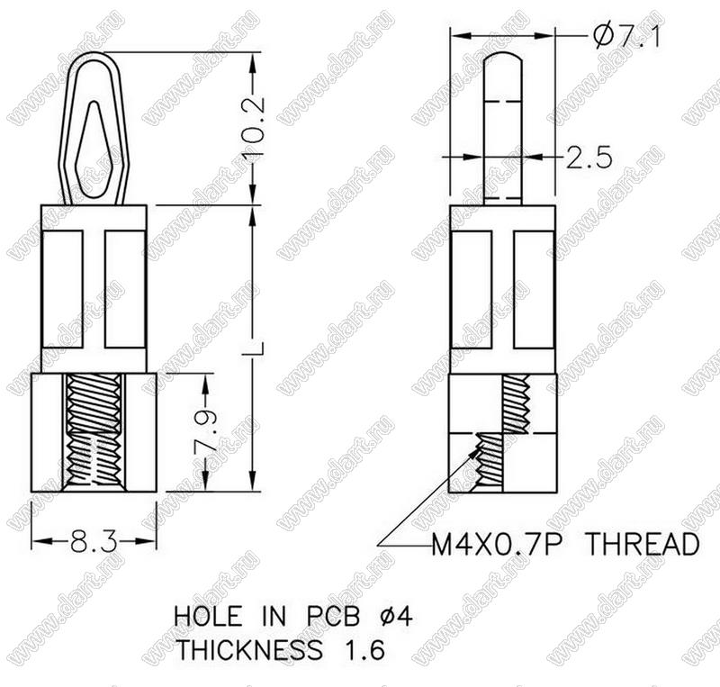 Диаметр отверстия в плате dп: Фиксатор платы с защелкой и отверстием с резьбой М4 мм Толщина платы s: 4,0 мм Материал: нейлон-66 (UL) Класс огнестойкости: 94V-2 Цвет: натуральный |