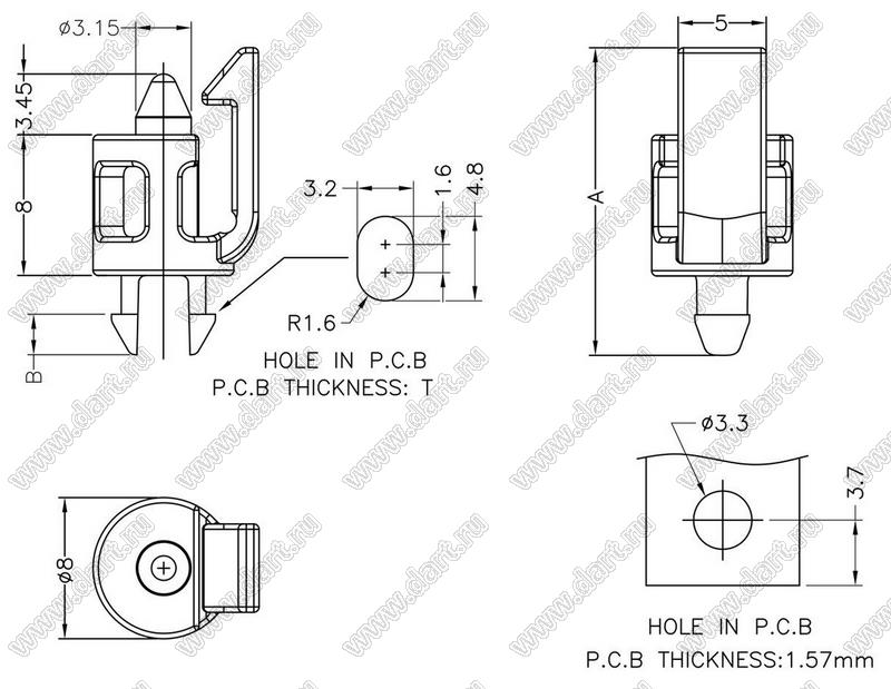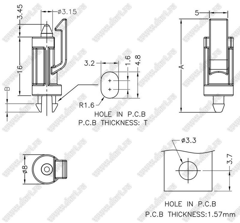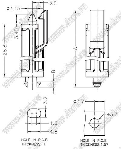Диаметр отверстия в плате dп: 3,3 мм Толщина платы s: T мм Материал: нейлон-66 (UL) Класс огнестойкости: 94V-2 Цвет: натуральный |