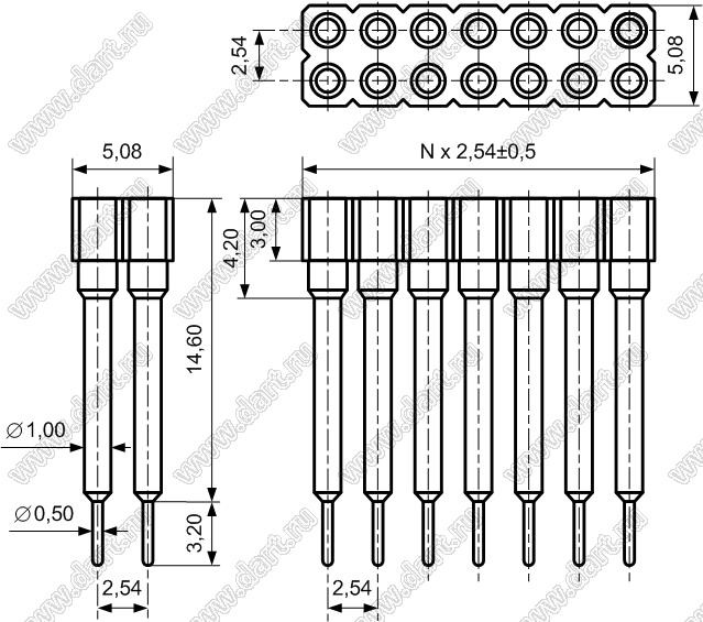 гнезда цанговые прямые двухрядные приподнятые для выводного монтажа, шаг 2,54x2,54 мм, тип 2, L=14,60 мм