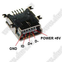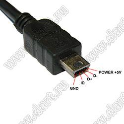 1: +5V, (Красный); 2: D-, (Белый); 3: D+, (Зелёный); 4: GND/ NO, (сиреневый); 5: GND, (Чёрный)