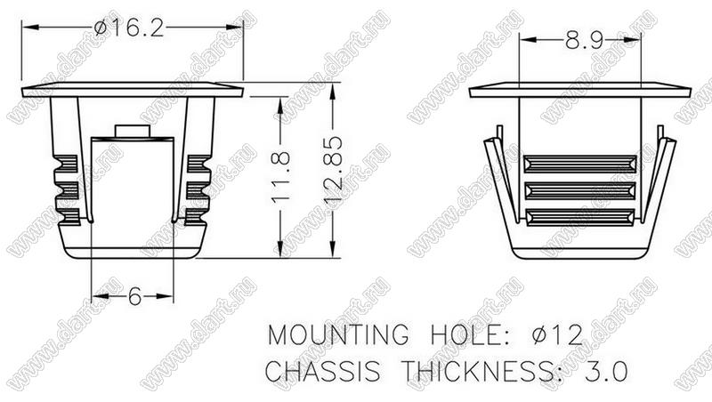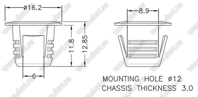 Диаметр отверстия Dотв.: 12,0 мм Материал: нейлон-66 (UL) Класс огнестойкости: 94V-0 Цвет: натуральный |