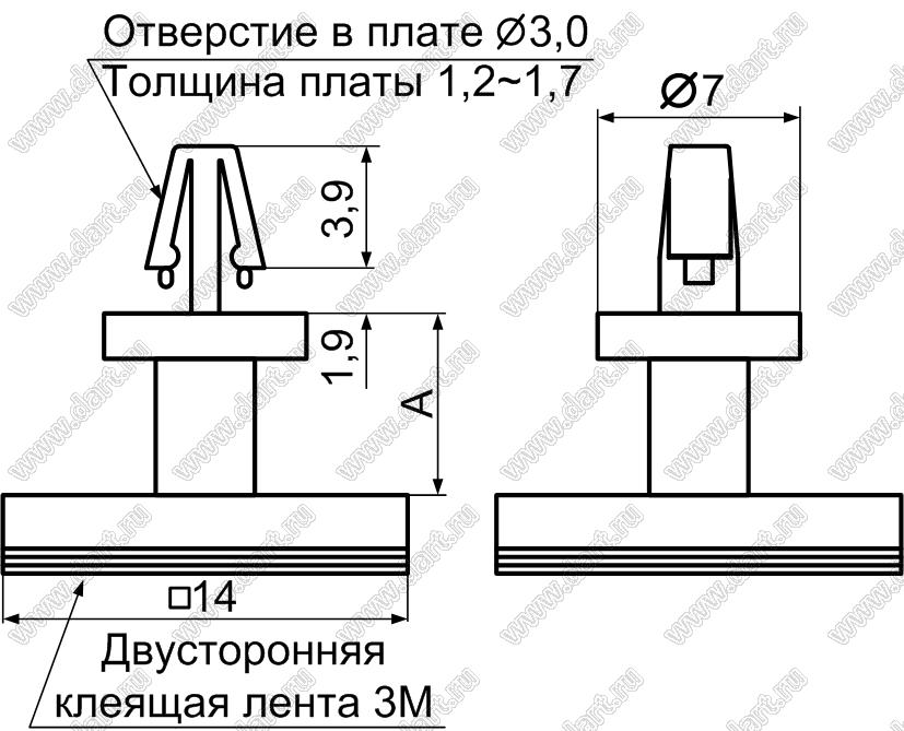 Размер площадки: 14x14 мм Диаметр отверстия в плате dп: 3,0 мм Толщина платы s: 1,2...1,7 мм Материал: нейлон-66 (UL) Класс огнестойкости: 94V-2 Цвет: натуральный |