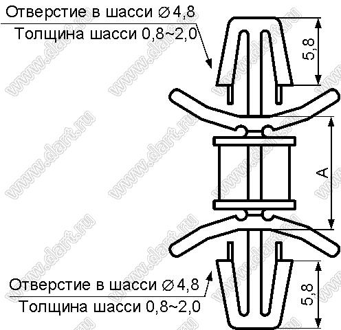 Диаметр отверстия в плате dп: 4,8 мм Толщина платы s: 0,8...2,0 мм Диаметр отверстия в шасси d отв.: 4,8 мм Толщина шасси t: 0,8...2,0 мм Материал: нейлон-66 (UL) Класс огнестойкости: 94V-2 Цвет: натуральный |