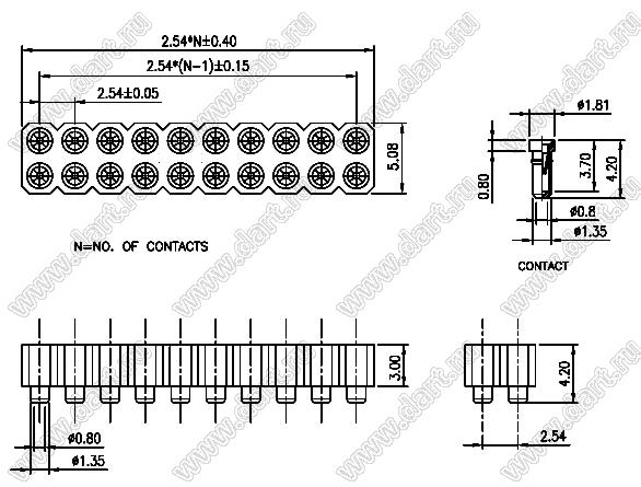 гнезда цанговые прямые двухрядные для выводного монтажа, шаг 2,54x2,54 мм, L=4,20 мм