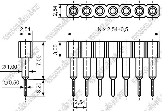 гнезда цанговые прямые однорядные приподнятые для выводного монтажа, шаг 2,54 мм, тип 1, L=7,00 мм