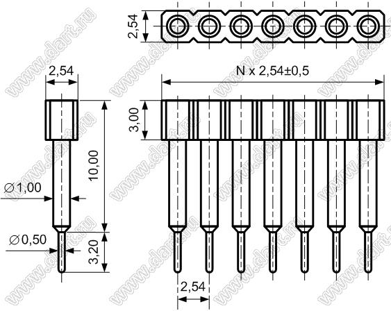 гнезда цанговые прямые однорядные приподнятые для выводного монтажа, шаг 2,54 мм, тип 1, L=10,00 мм