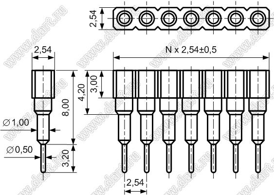 гнезда цанговые прямые однорядные приподнятые для выводного монтажа, шаг 2,54 мм, тип 2, L=8,00 мм