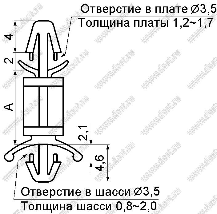 Серия фиксаторов плат нейлоновых предназначена для крепления печатной платы на постоянном расстоянии от шасси. Диаметр отверстия в плате 3,5 мм, толщина платы 1,2~1,7 мм, диаметр отверстия в шасси 3,5 мм, толщина шасси 0,8~2,0 мм. Фиксаторы этой серии поставляются со склада в Москве и под заказ с фабрики со сроком производства 2-3 недели, плюс доставка до Москвы. Условия поставки уточняйте у менеджеров.
