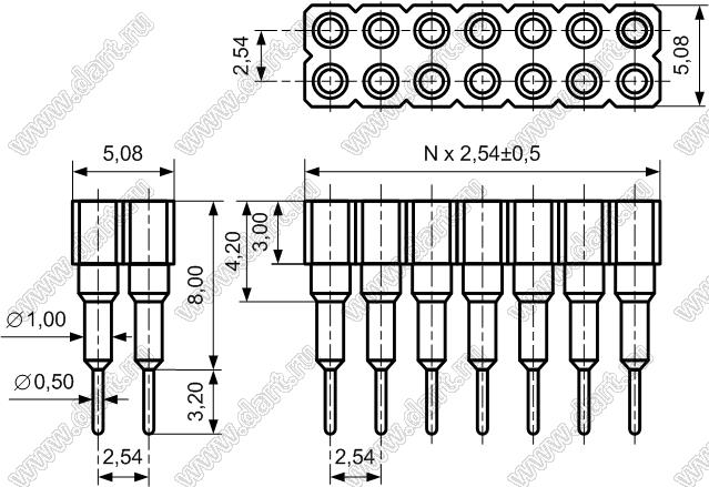 гнезда цанговые прямые двухрядные приподнятые для выводного монтажа, шаг 2,54x2,54 мм, тип 2, L=8,00 мм