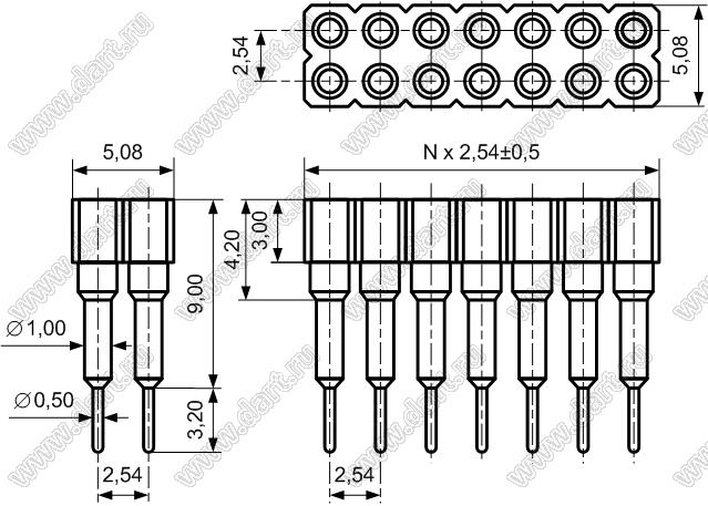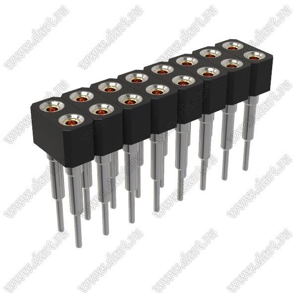 гнезда цанговые прямые двухрядные приподнятые для выводного монтажа, шаг 2,54x2,54 мм, тип 2, L=9,00 мм