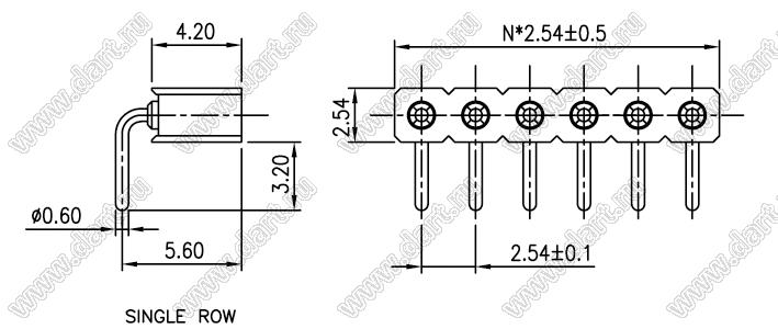 гнезда цанговые угловые однорядные для выводного монтажа, шаг 2,54 мм, L=4,20 мм