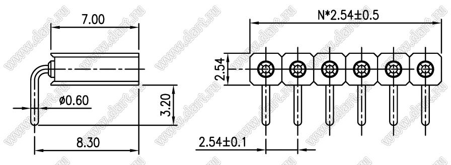 гнезда цанговые угловые однорядные для выводного монтажа, шаг 2,54 мм, L=7,00 мм