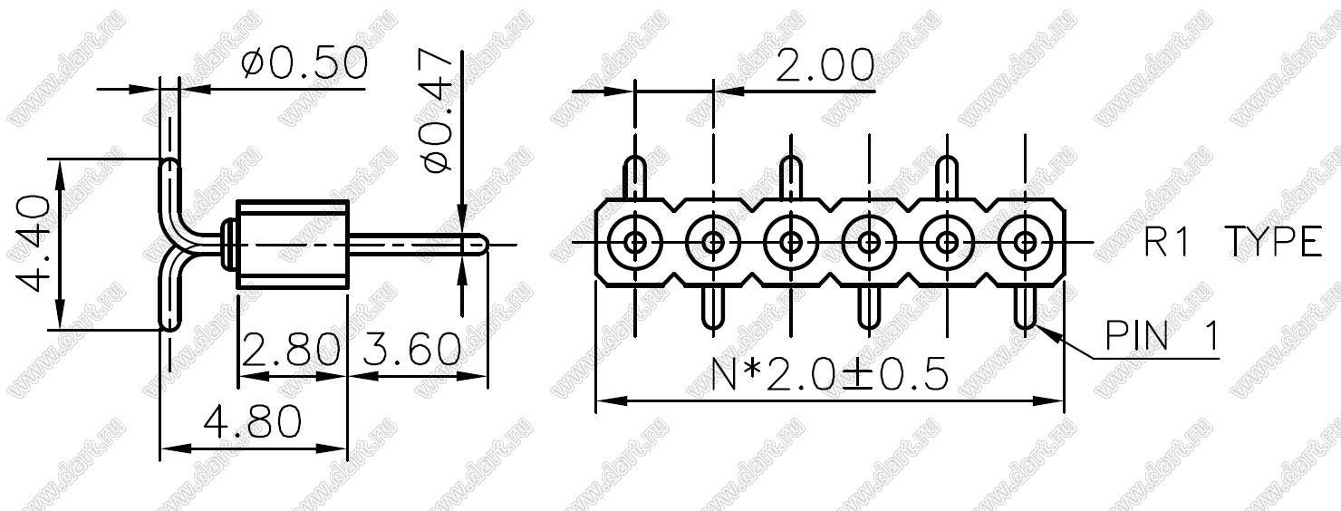 вилки цанговые прямые однорядные для поверхностного (SMD) монтажа, тип R1, шаг 2,0 мм