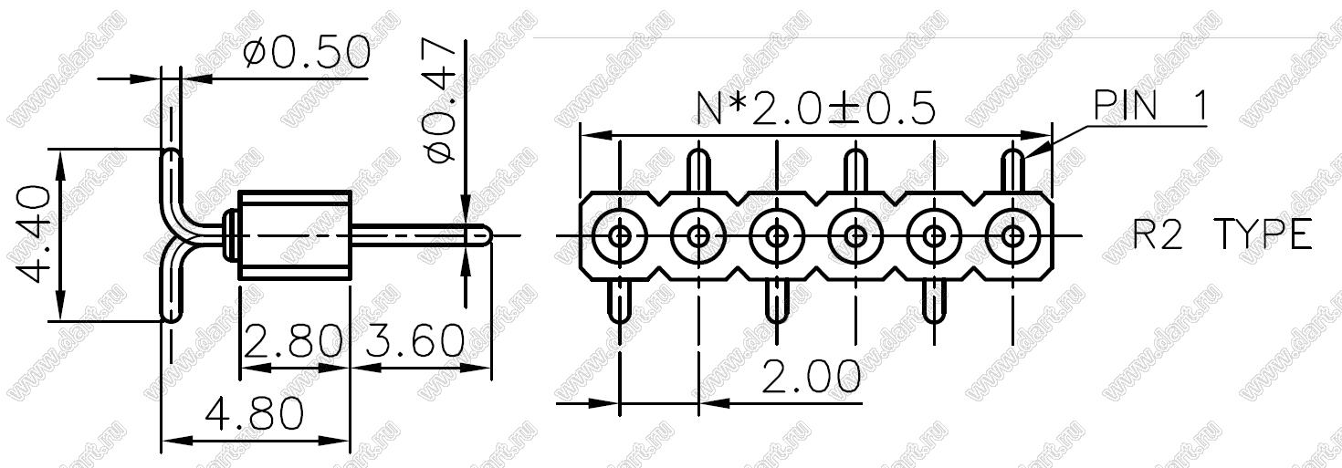 вилки цанговые прямые однорядные для поверхностного (SMD) монтажа, тип R2, шаг 2,0 мм
