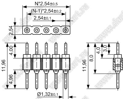 вилки цанговые прямые однорядные для выводного монтажа, шаг 2,54 мм