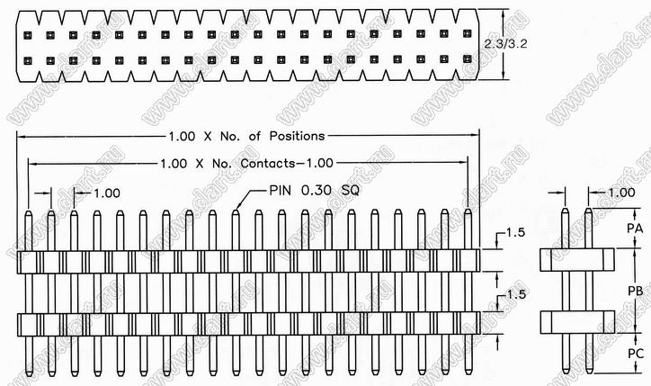 вилки штыревые двухрядные с двойным изолятором прямые, шаг 1,0 мм