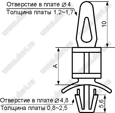 Диаметр отверстия в плате dп: 4,0 мм Толщина платы s: 1,2...1,7 мм Диаметр отверстия в шасси d отв.: 4,8 мм Толщина шасси t: 0,8...2,5 мм Материал: нейлон-66 (UL) Класс огнестойкости: 94V-2 Цвет: натуральный |