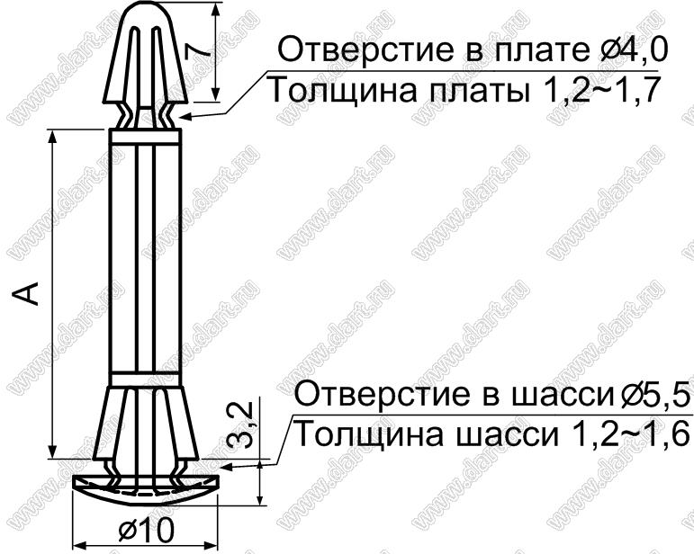 Диаметр отверстия в плате d: 4,0 мм Диаметр отверстия в шасси d: 5,5 мм Толщина шасси t: 1,2...1,6 мм Материал: нейлон-66 (UL) Класс огнестойкости: 94V-2/94V-0 Цвет: натуральный |