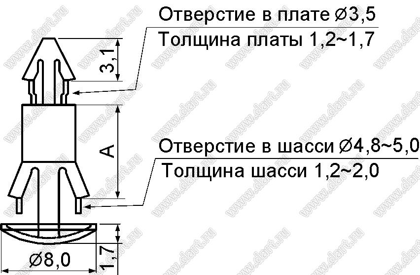 Диаметр отверстия в плате dп: 3,5 мм Толщина платы s: 1,2...1,7 мм Диаметр отверстия в шасси d отв.: 4,8...5,0 мм Толщина шасси t: 1,2...1,7 мм Материал: нейлон-66 (UL) Класс огнестойкости: 94V-2 |