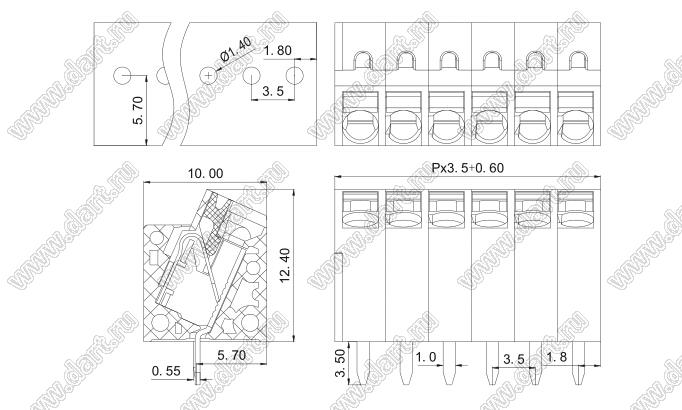 Клеммники нажимные, прямые, с входами проводов под углом, шаг 3,5 мм