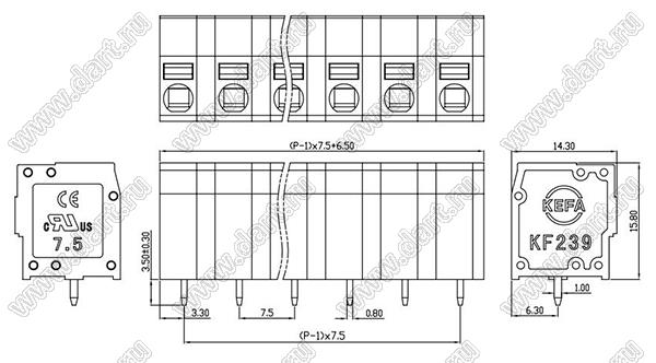 Клеммники нажимные KF239-7.5 серии с шагом 7.5 мм, прямые, предназначены для монтажа в отверстия печатних плат. Конструкция соответствует международным стандартам IEC60998, UL1059, UL486E, CSA C22.2 No.158. Условия поставки клеммников нажимных KF239-7.5 серии уточняйте у наших менеджеров.