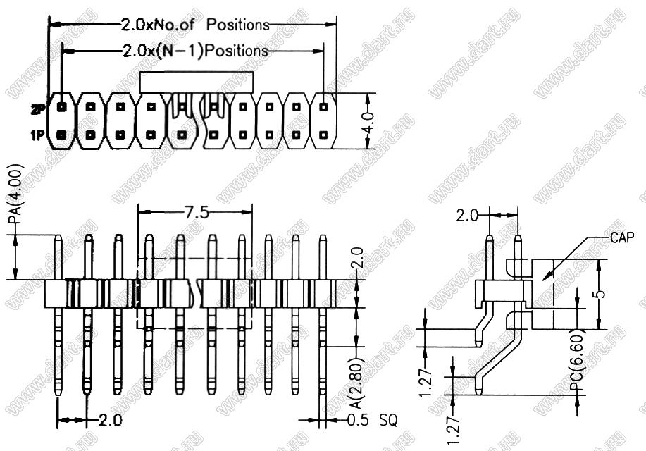 Вилки штыревые двухрядные для поверхностного (SMD) монтажа горизонтальные (шаг 2,0x2,0 мм)