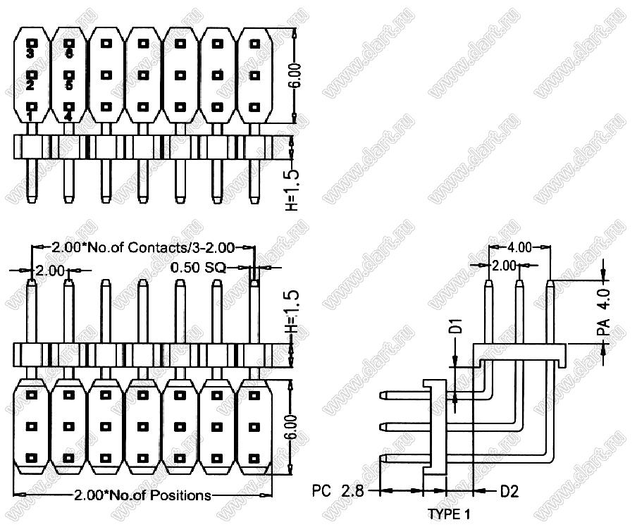 Вилки штыревые трехрядные угловые с двойным изолятором угловые (шаг 2,0x2,0 мм), тип R1
